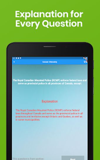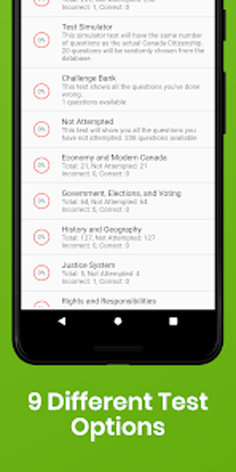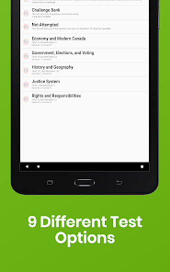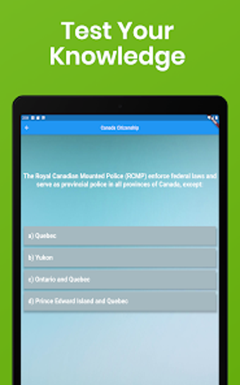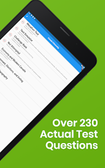 Denna applikation är utformad för att hjälpa dig med det kanadensiska medborgarskapstestet. Med över 200 faktiska frågor kommer du att lära dig om Kanadas historia, geografi, ekonomi, symboler, rättssystemet och rättigheterna och skyldigheterna som kanadensisk medborgare direkt här på din Android-telefon eller surfplatta.